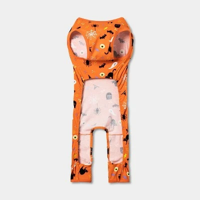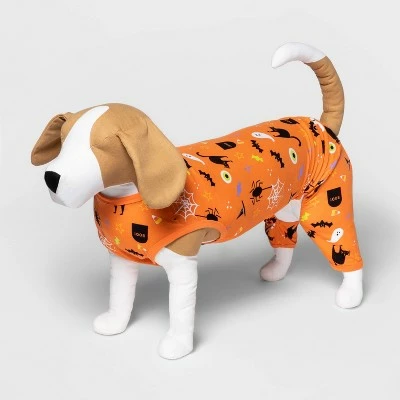 Get your pets in on your fright-night festivities with the Halloween Matching Family Sleep Dog and Cat Pajama from Hyde & EEK! Boutique™. This pullover pajama for your cat or dog is made of a cotton fabric with added spandex for extra roomy stretch, and is covered in spiders, webs, witches’ hats and more against an orange background to give your cat or dog a cute holiday look to sleep in, or even wear outdoors as a costume! Great for dogs and cats up to 10 pounds, it can be hand washed for wearing all through the spooky season.