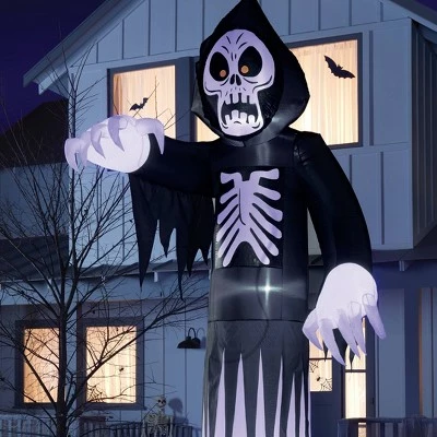 This 12-Foot LED Reaper Inflatable Halloween Decoration from Hyde & EEK! Boutiqueâ„¢ makes a creepy and unique addition to your Halloween decor. Measuring about twelve feet tall, this inflatable decoration showcases a white skeleton reaper in tattered black robes with red eyes and clawed hands. It also features black LED lights for a fun glow. The reaper stands on its own and is suitable for indoor and outdoor use, so you can arrange it anywhere from your entryway to your front porch or lawn.
