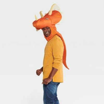 Show off your hilarious Halloween style this season with the Adult Oversize Triceratops Halloween Costume Mask from Hyde & EEK! Boutiqueâ„¢. Made from a lightweight material, this costume headpiece features a Triceratops head in shades of orange and tan for humorous Halloween fun. With an open-face design that allows for breathability and convenient wear, this oversize Triceratops costume mask provides a quick and easy costume for attending Halloween parties, handing out candy and more.