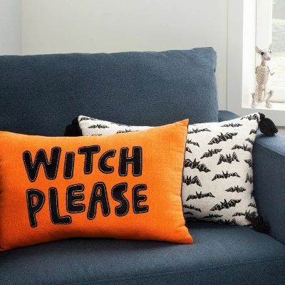 Spruce up your Halloween decor with the Bat Lumbar Throw Pillow from Hyde & EEK! Boutiqueâ„¢. Constructed from a lightweight fabric, this decorative throw pillow features allover black bat print set against an ivory background with black corner tassels for added flair. Intended for indoor use only, it looks great on its own or paired with Halloween-themed blankets or other decor pieces.