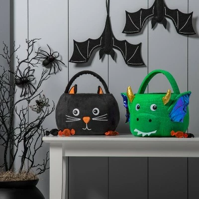 Your kid will have a blast on Halloween night carrying this Dragon Plush Halloween Trick-or-Treat Pail from Hyde & EEK! Boutiqueâ„¢. Made from plush fabric in a green hue, this dragon candy pail features a cute face, purple wings and gold horns. Designed with a top handle for easy carrying, it’s sure to help your kid gather more candy than any of the past years.
