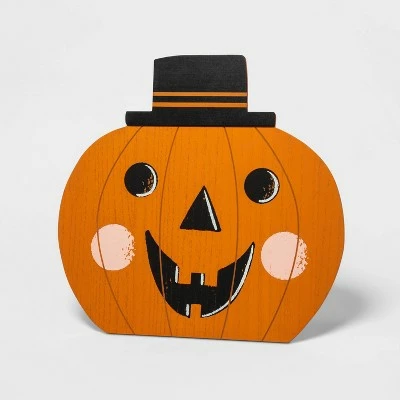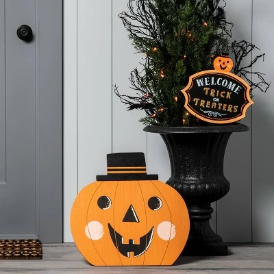 Dress your porch up for Halloween with this Pumpkin Wood Porch Halloween Sign from Hyde & EEK! Boutiqueâ„¢. Made from wood, this sign showcases a smiling orange pumpkin with rosy cheeks and a black hat. It includes an attached string for optional hanging from a hook or nail, and you can also simply place it on your porch floor alone or with other seasonal decorations.