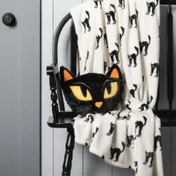 You and your furry friend will love this Faux-Fur Cat Throw Pillow from Hyde & EEK! Boutiqueâ„¢. Constructed from soft faux-fur fabric, this decorative throw pillow is shaped like the face of a black cat with yellow eyes, an orange nose, orange ears and whisker details. Intended for indoor use only, it looks great on its own or paired with Halloween-themed blankets or other decor pieces.