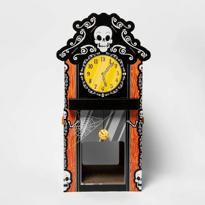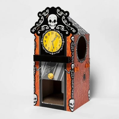 Keep your cat’s claws under control while adding a fun and spooky touch to your Halloween decor with this Halloween Clock Double Decker Cat Scratcher from Hyde & EEK! Boutiqueâ„¢. This double decker cat scratcher is designed to look like a creepy clock tower with skeleton and spiderweb accents and a skull above the clock face. The scratcher has two levels, each with its own entrance and scratchable floors, and a hanging yellow ball toy at the front provides your cat with even more entertainment.
