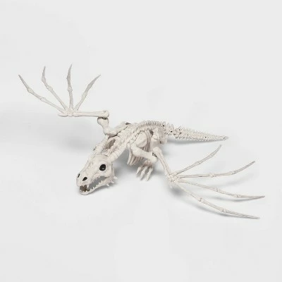 Dragons are in this year, so get this Hanging Dragon Skeleton Halloween Decorative Scene Prop from Hyde & EEK! Boutiqueâ„¢ to add to your spooky display. Designed with a 36-inch wingspan, this realistic dragon skeleton prop is large enough to stand out among your other Halloween decor. Designed for indoor and outdoor use, it can be displayed on your front porch or in your living room or entryway and can be placed on a flat surface or hung overhead for extra chills.
