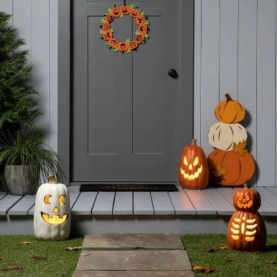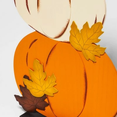 - Features stacked pumpkins in festive fall hues with leaf accents