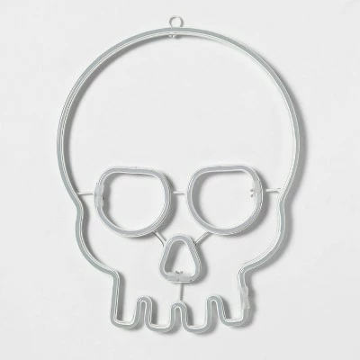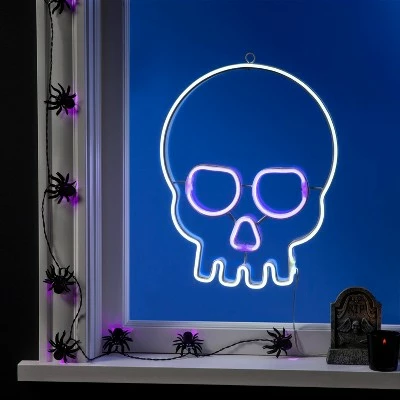 Spookify any window, door or wall with the LED Faux Neon Skull Halloween Novelty Silhouette Light from Hyde & EEK! Boutiqueâ„¢. Glowing in white and purple, this novelty light makes a cool addition to your Halloween decor. It features a skull shape made of 252 durable, long-lasting LED lights that give it the look of a neon light. You can easily hang it anywhere you want using the attached hanging ring to create a scary-fun atmosphere for Halloween parties or trick-or-treating.