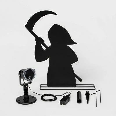 Cast a ghoulish glow with the LED Reaper Shadow Maker Green Halloween Special Effects Light from Hyde & EEK! Boutiqueâ„¢. The spotlight creates a grim reaper shadow on a wall when the green light is shone on the standing hooded reaper figure. Ground stakes are included so you can use this special-effects light prop indoors or out. The 72-inch cord gives you ample room to roam and the cool long-lasting LED bulb ensures everyone will see the show.