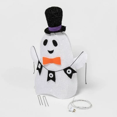 Light up the night with the Light Up Ghost BOO Halloween Novelty Sculpture Light from Hyde & EEK! Boutiqueâ„¢. This sculpture light makes a fun addition to your home Halloween props during the spooky season. It features a ghost with a top hat holding a banner that reads “BOO.” The light-up ghost includes 20 clear lights and requires no batteries. Use it indoors or outdoors to create a scary atmosphere for hosting Halloween parties or welcoming trick-or-treaters.