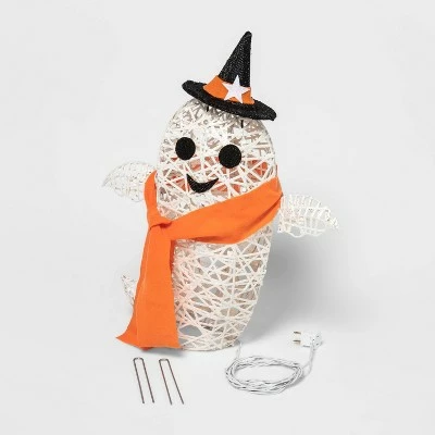 Add some whimsical flair to your walkway with the Light Up Ghost Halloween Novelty Sculpture Light from Hyde & EEK! Boutiqueâ„¢. Indoors or outdoors, this sculpture light makes a unique addition to your Halloween props. It features the figure of a smiling ghost wearing a witch-style hat and an orange scarf. The light-up prop includes 30 clear lights and requires no batteries. Use it to create a spooky-fun atmosphere for Halloween parties or trick-or-treating.