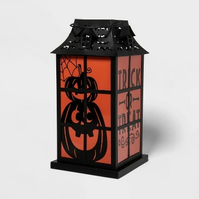 Illuminate your porch or entryway for trick-or-treaters with this Light-Up Large Halloween Decorative Lantern from Hyde & EEK! Boutique™. Made from metal in black and orange hues, this decorative lantern features pumpkin print as well as the words “Trick or Treat.” Powered by 3 AAA batteries (not included), it adds a warm orange glow wherever you place it.