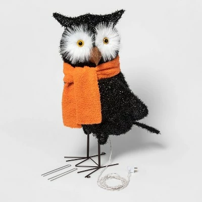 It’ll be a hoot when you display the Light Up Owl Halloween Novelty Sculpture Light from Hyde & EEK! Boutique™, indoors or outside. This sculpture light makes a unique addition to your Halloween props. It features a wide-eyed standing owl in black sporting an orange scarf. The light-up prop includes 20 clear lights and requires no batteries. Use it indoors or outdoors to create a scary-fun atmosphere for Halloween parties or trick-or-treating.