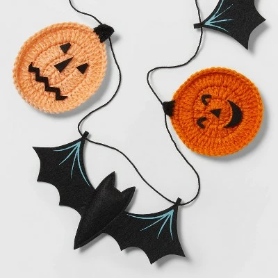 - Crochet-like pumpkin and bat Halloween garland