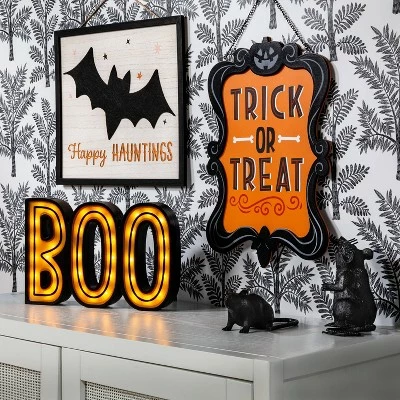 Welcome party guests or trick-or-treaters to your home this Halloween with the Trick or Treat Wood Halloween Sign from Hyde & EEK! Boutiqueâ„¢. Made from wood composite, this sign features the words “Trick or Treat” in black on an orange backdrop with a black frame, with bone and jack-o’-lantern accents adding some extra seasonal charm. The sign hangs vertically with the help of the attached metal link chain, making it easy to display above the mantel, on a wall or outside your front door.