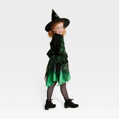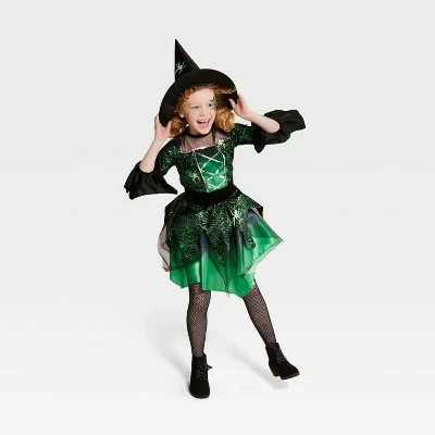- Includes belt, spider-witch dress and hat in shades of green and black