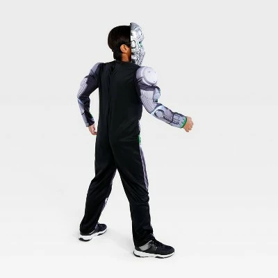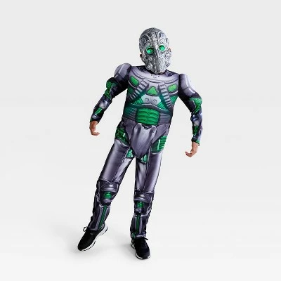 - Includes silver-and-green robot jumpsuit with mask