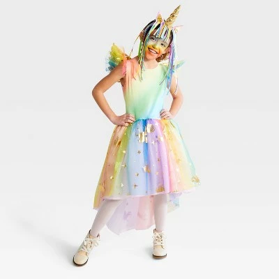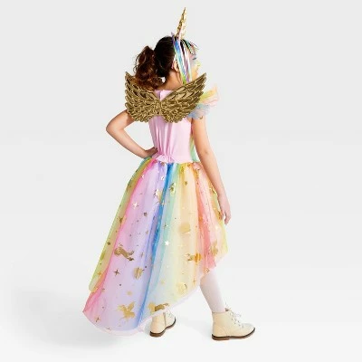 - Includes rainbow unicorn dress, golden wings and headpiece