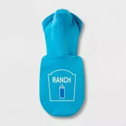 Your furry friends will look good enough to eat in this Ranch Dressing Hoodie Dog and Cat Costume from Hyde & EEK! Boutique™. Designed to look like a bottle of ranch dressing, this hilarious full-body costume features a vibrant blue onesie with the text “ranch”, a hood and an illustration of a ranch bottle. Intended for cats and small dogs, this lightweight costume is sure to get people talking and tails wagging.