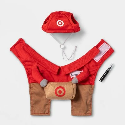 - Red, white and brown Target delivery uniform with logo, hat and attached package